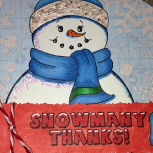 Hello...I created this round thank you card to enter into this weeks Peachy Keen Challenge, anything goes. I'd love to enter the Christmas Tree that I'm making, but I'm not finished just yet. So I'll share that with you later. For now, here's this snowman...